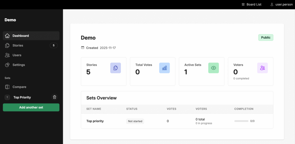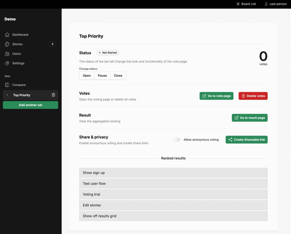 The workflow is the same no matter what, you create a new board, add any number of stories to it, then you add a criteria to rank them on. This is what forms a Set